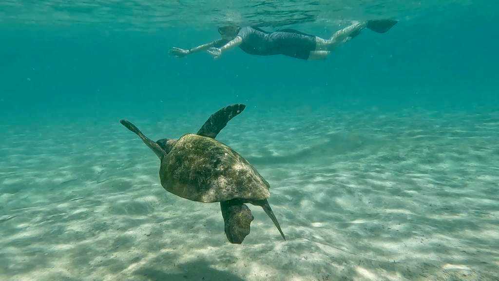 For our second full day we’d booked on to a snorkelling tour to Pinzon, a small island a couple of hours boat ride away. Due to the time of year the boat ride was quite choppy, although thankfully no-one on our boat got seasick. Our first stop was a small rock in the sea to see some sea lions basking in the sun, and try to catch some fish. We then motored on to Pinzon itself, and the first of the snorkelling stops. This was probably one of the most incredible experiences of the trip as within minutes of getting in the water we were swimming alongside a green sea turtle. As we then headed to deeper, crystal clear water, we were swimming behind a huge shoal of yellow tailed fish, with white tipped sharks on the sea bed below us. We then rounded a corner to a shallower area with more sea turtles, allowing us to capture some incredible videos of them. All in all we were in the water for over an hour but it literally flew by (although we were thankfully kept warm by our rented wetsuits).