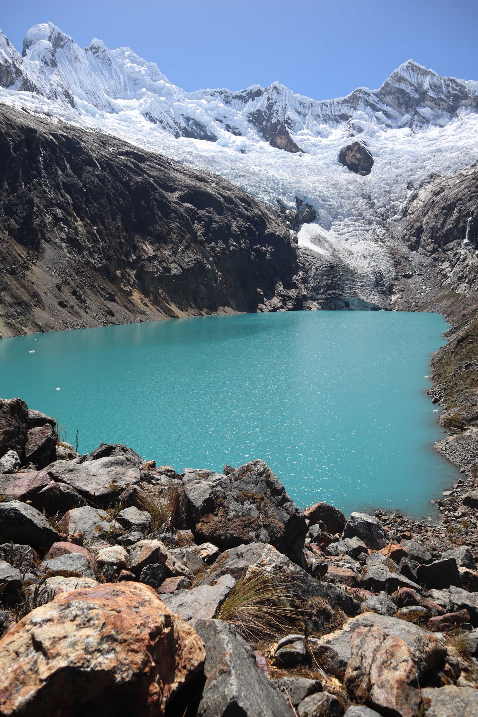 Our third day was to be our longest walking day, taking an excursion from the normal route to our next campsite to ascend 400m to view the Paramount mountain from a better perspective, and visit Lake Arhuaycocha at 4,450m. The previous night we were told if the weather was not good we wouldn’t be able to visit the lake, so would get a lie in until 7.30, so we were grateful to be woken at 6am with our usual Coca tea to beautiful clear sky’s and the sun cresting the mountain peaks.