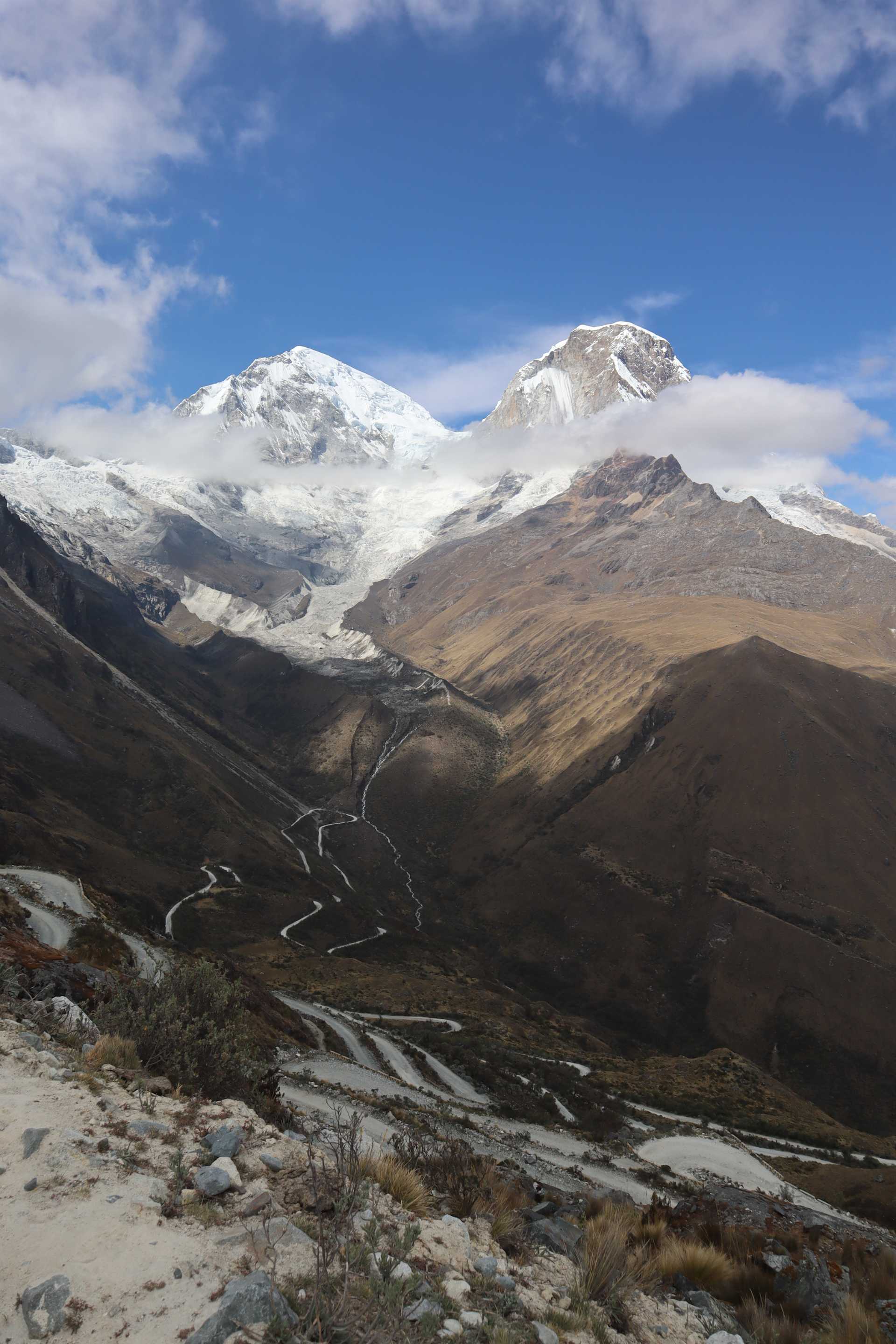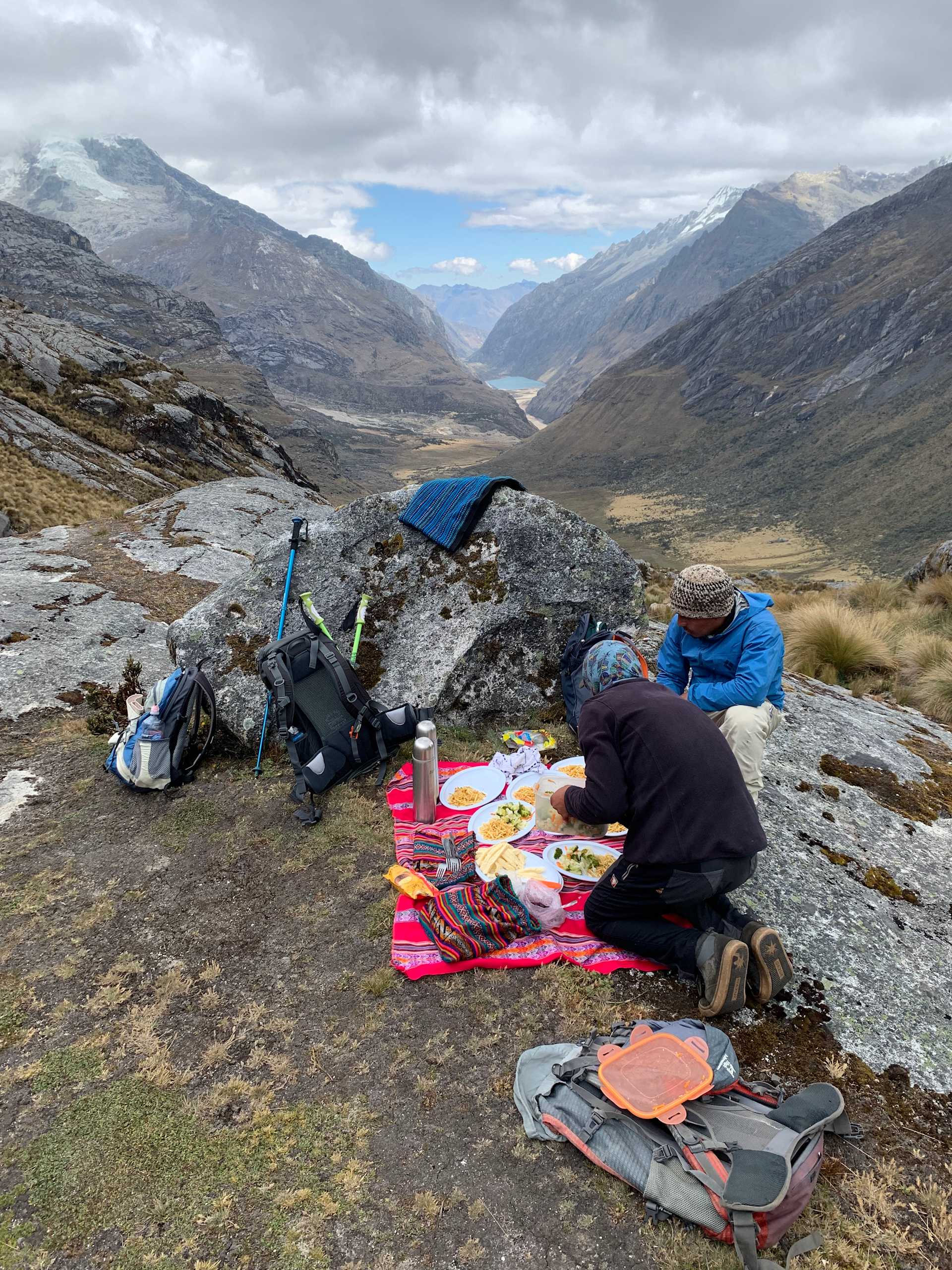 The first day started off on a small trail from the town and back into the Huascaran National park. Albeit being advised it would be mostly flat, it was definitely up and down with 600m’s of accent. We quickly learnt the Peruvian definition of flat meant the ground was easy going, not the nature of the elevation. Within two hours we had stopped for lunch which was delicious, giving us confidence we would be eating well for the next few days. Our hike continued up a steep section, up into a valley and across sweeping fields into a green landscape as we arrived into the national park.