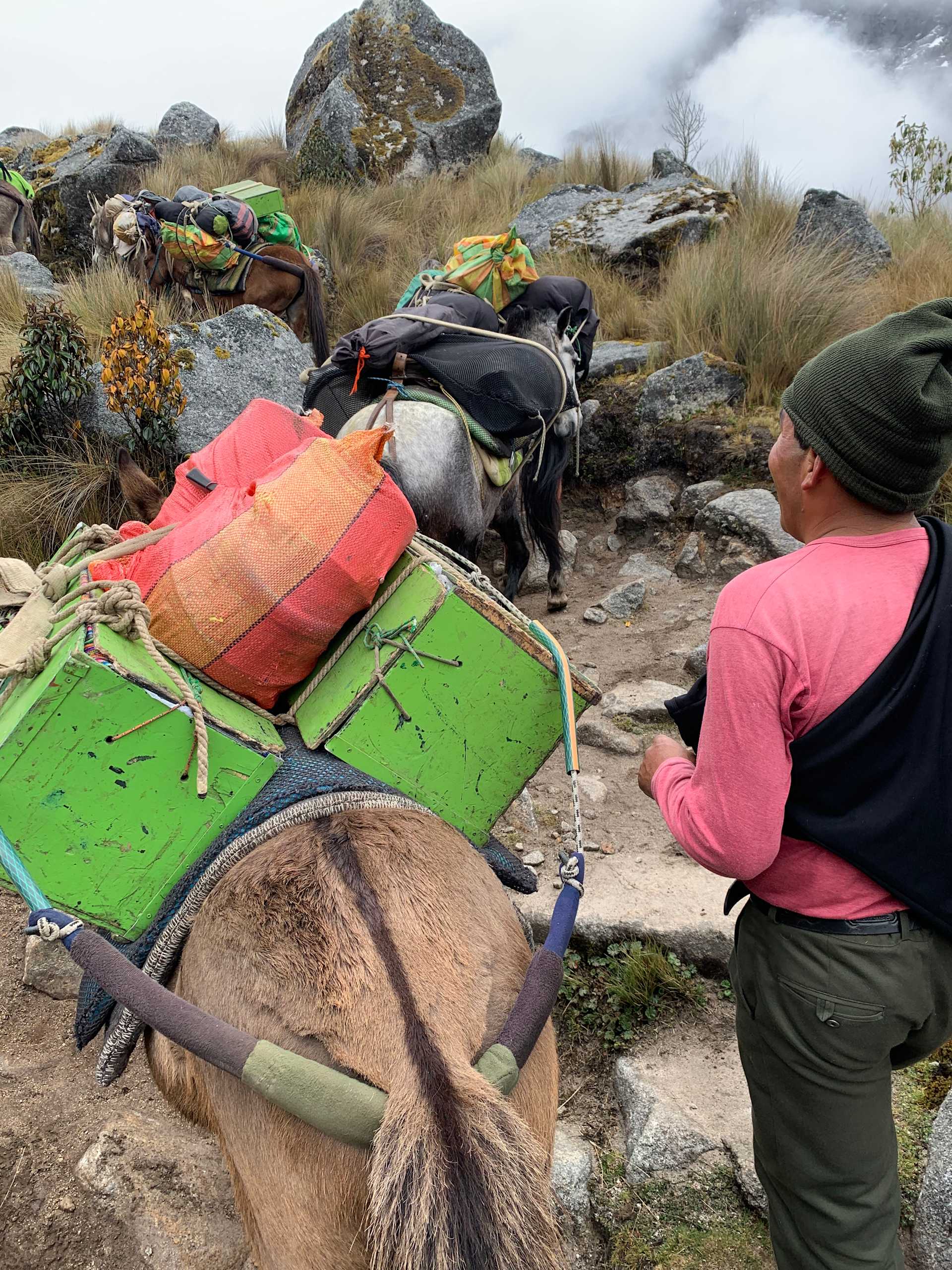 We were greeted by our guide Javier from Eco Ice, and met our group of five; one from Brazil, one from Peru and three from the Netherlands. We stopped two hours into the journey for a breakfast, and our first of many coca teas. Following breakfast, we stopped two more times, first to view the lagoon we had first seen en-route to Laguna 69, and again at the highest point of our trek at 4767m for views over the valley and the snow capped peaks. From here it was another two hours of bumpy, twisty roads until we arrived in the village of Vaqueria, to load our donkeys with gear and start the first of our four day hike. Upon arrival we quickly received the first of our daily snack packs intended to keep us energised for the miles ahead.