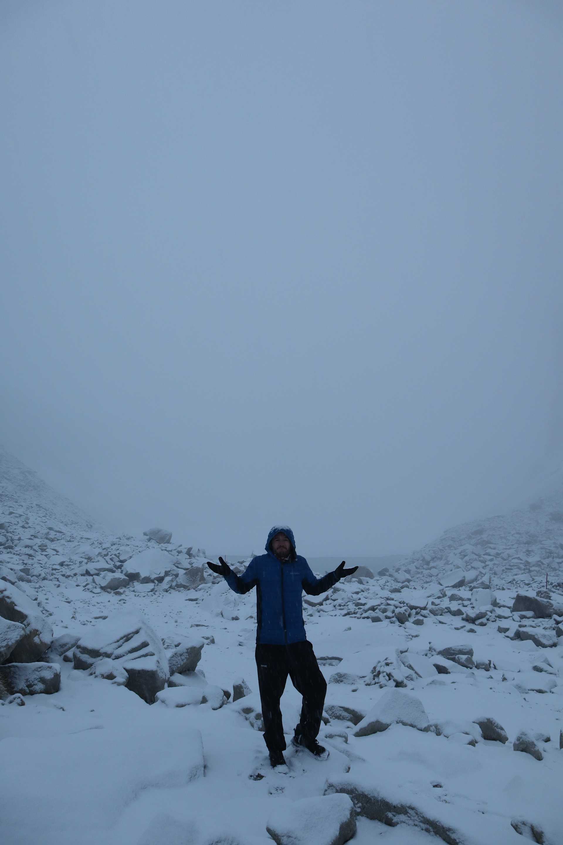 With our alarm set for 4:30am to try and catch the sunrise we were up and out in the dark, quickly packing up the tent and setting out with just our head torches to guide us. The path initially wound up and down through a wooded section for a couple of miles before we hit a steep, rocky climb. At this point it was snowing quite heavily, although we were still semi protected by the trees overhead. After some climbing the path became exposed as we neared the top, winding our way around the final part of the mountain, now covered in a layer of snow. The going was slow at this point as it slowly got lighter around us. Soon we reached the top, only to find the view of the base of the Torres completely concealed by white snow clouds! After waiting a few minutes, and starting to feel the cold, we decided to start our way back down through the now compacted and slippy snow. Unfortunately, about 10 minutes after we started to descend the sky did start to clear and we met lots of people who had gone down going back up to see the view. With Sarah’s hesitancy on snow, coupled with the distance back, we decided to keep going down and made it to the Refugio just after 9am for a cup of tea to warm up. After a little rest we decided to press on for the final stretch to the Welcome centre. This was mainly a steep downhill walk and we were happy when the path flattened out around the Hotel Torres. The welcome centre was a truly welcome (!) sight and, arriving at 12pm, we immediately got two Patagonian beers to celebrate having made it!