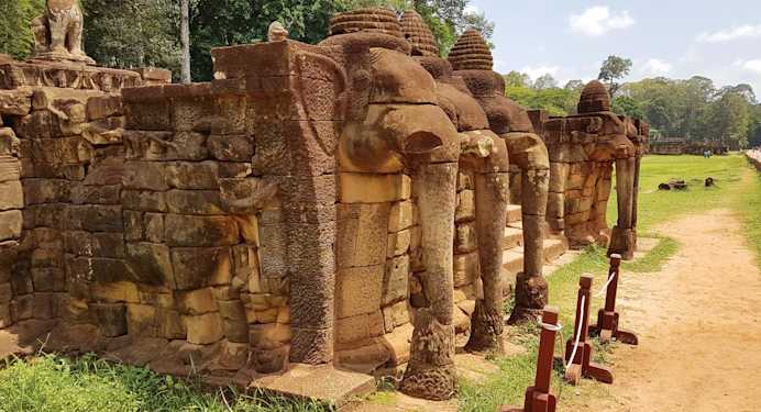 The Terrace of the Elephants, so called because of the stunning carvings of elephants as far as the eye can see, is a beautifully renovated ornamental terrace wall within the city walls of Angkor Thom.