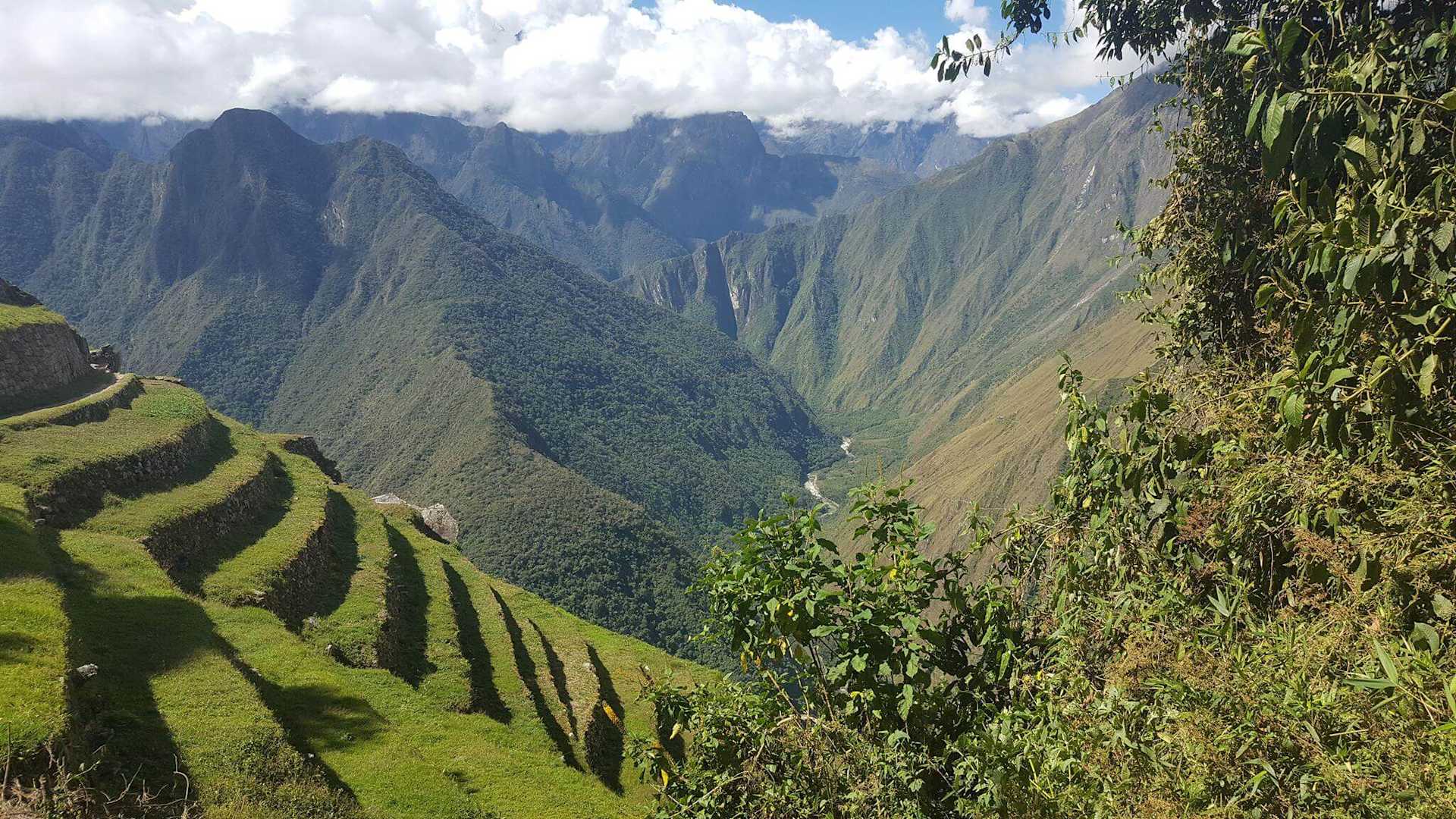 This part of the trail is particularly beautiful, surrounded by the lush and verdant cloud forest and spectacular views of the Andes in the distance. After our third and final pass of Phuyupatamarca, it's all downhill - around 3000 steps down - heading into the rain forest and leading to the terraces of Intipata. One of the highlights of the trail ruins, the ruins of Intipata are beautiful, consisting of countless terraces banked steeply above one another. The amazing mountain setting offered amazing views, and our first glimpse of the river Urubamba since day one on the trek.